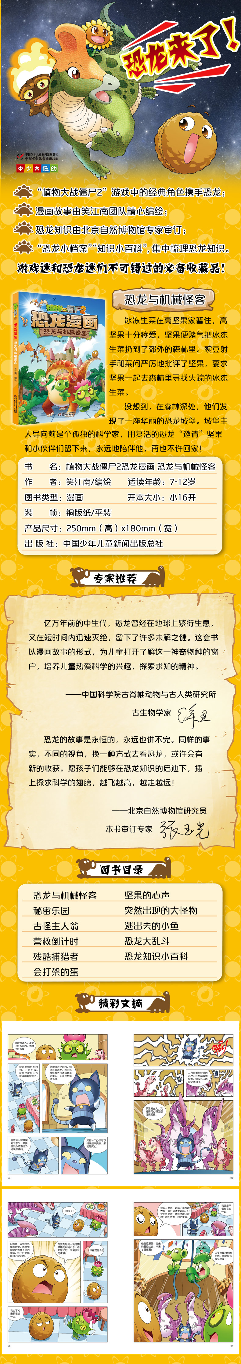 “植物大战僵尸2恐龙漫画”系列图书是中少大低幼为游戏迷和恐龙迷们打造的一套寓教于乐的科普漫画故事书。这套书将“植物大战僵尸2”游戏中的经典角色豌豆射手、菜问、坚果、红针花等带到遥远的中生代,与恐龙这一神奇生物相遇,共度一场场充满冒险与欢乐的旅程,同时也为小读者打开解恐龙的一扇窗。《恐龙与机械怪客》是其中一册,讲述了一个冒险故事。