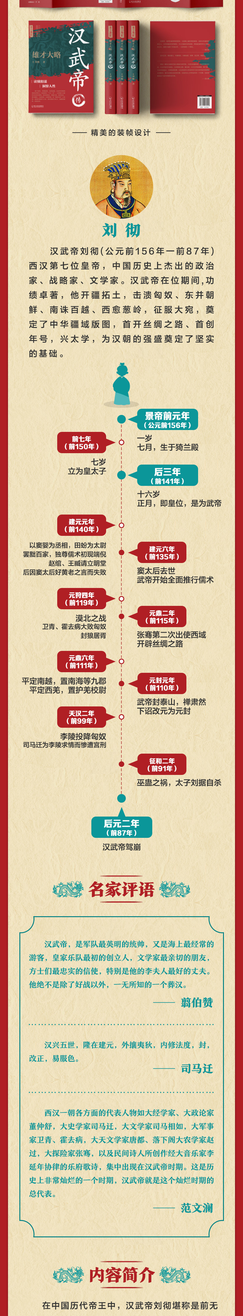 时代的需求就是我们的使命。为了更好地弘扬中华优秀传统文化,为了更好地向那些为中华民族发展壮大做出巨大贡献的帝王们致敬,我们策划了这套帝王传。在今天这样一个建设文化强国的新时代,我们更加有理由走进他们,走进他们的故事,领略他们的雄才大略、文治武功,以汲取不断前行的力量。
