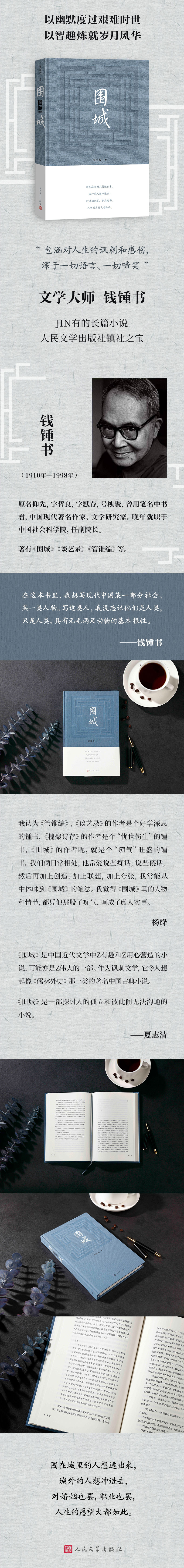 《围城》是中国现代文学史上一部风格独特的讽刺小说,钱锺书以他洒脱幽默的文笔,描写了一群知识分子的生活百态,被誉为“新儒林外史”。