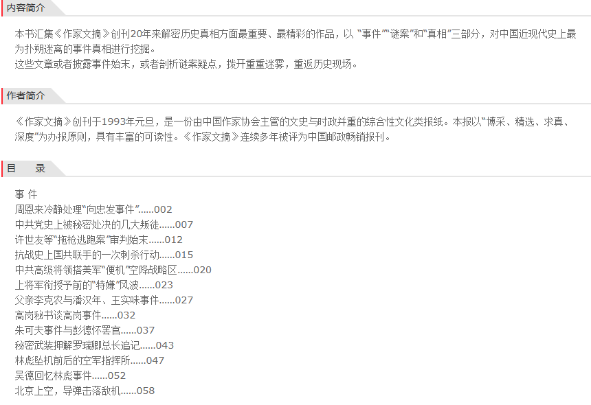 本书汇集《作家文摘》创刊20年来解密历史真相方面最重要、最精彩的作品,以 “事件”“谜案”和“真相”三部分,对