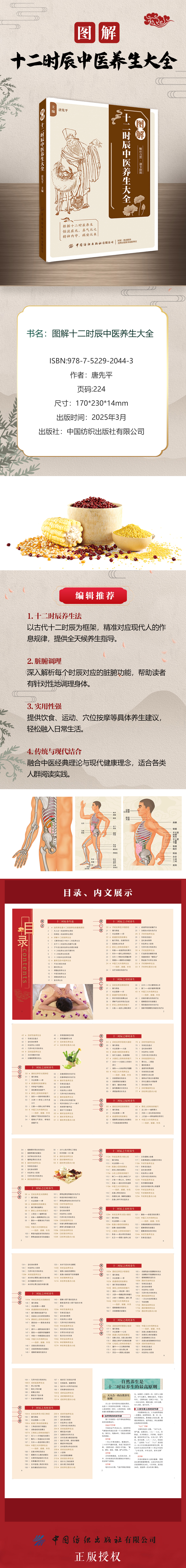 中医讲究“因天之序”,违背了这个顺序,就会百病缠身。这种变化叫四季节律。后来,中医将这种规律细分,应用到每一天,就是日节律。一天之序始于寅,终于丑;经气之序起于肺,终于肝。人也应顺应这个规律而养生,这就是十二时辰养生法。 但是,由于生活习惯的改变,现代人已经很难做到“日出而作,日落而息”了。这样就会导致“天”与“人”相冲突,而这正是现代疾病层出不穷的原因之一。《图解十二时辰中医养生大全》一书告诉我