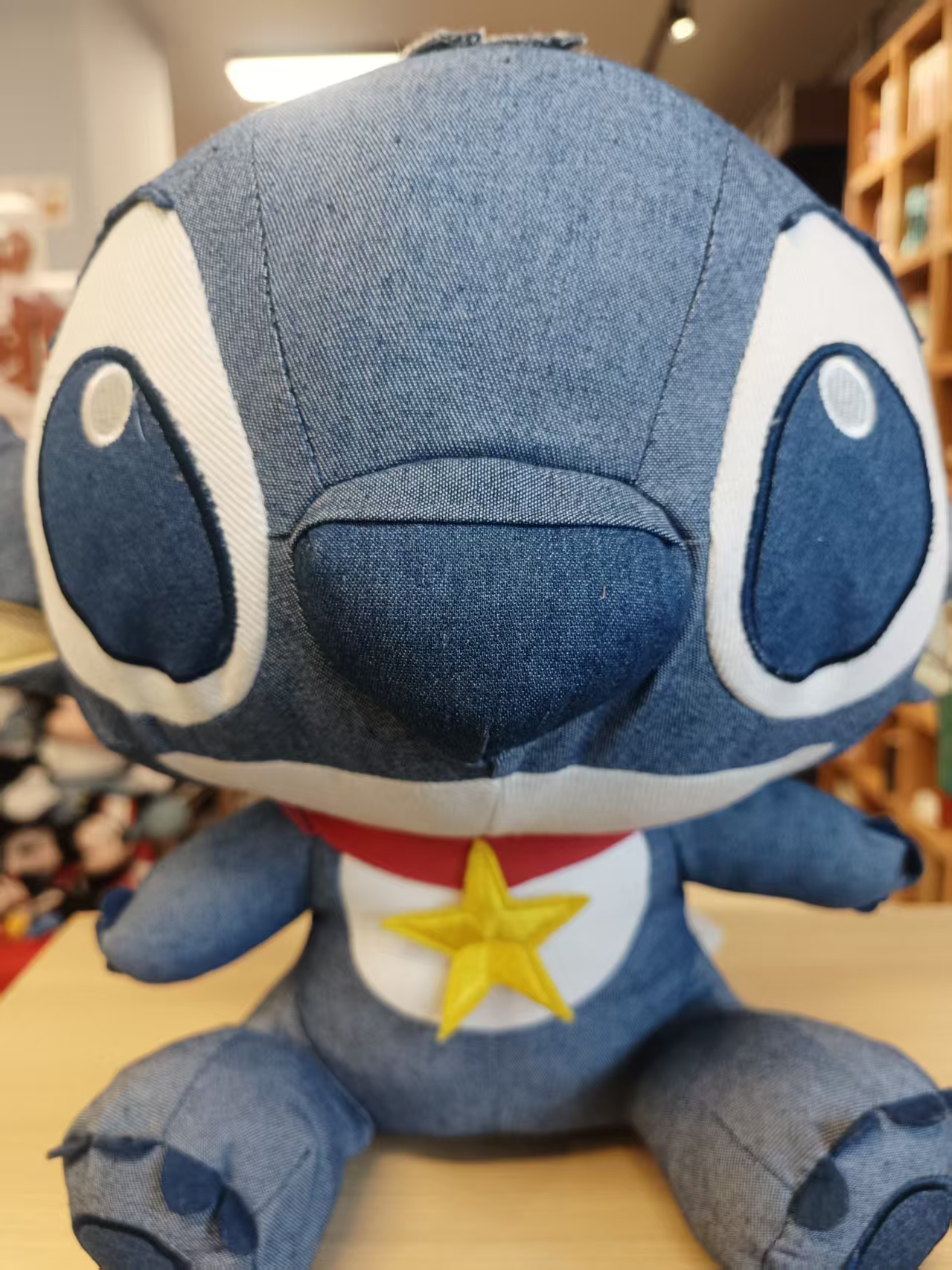 这是星际宝贝史迪奇牛仔布毛绒公仔,以经典角色史迪奇为原型,采用牛仔布材质打造独特外观,胸前有黄星、红白装饰,保留角色萌趣特征,是动漫周边,可作收藏、装饰或礼物,受粉丝喜爱 。