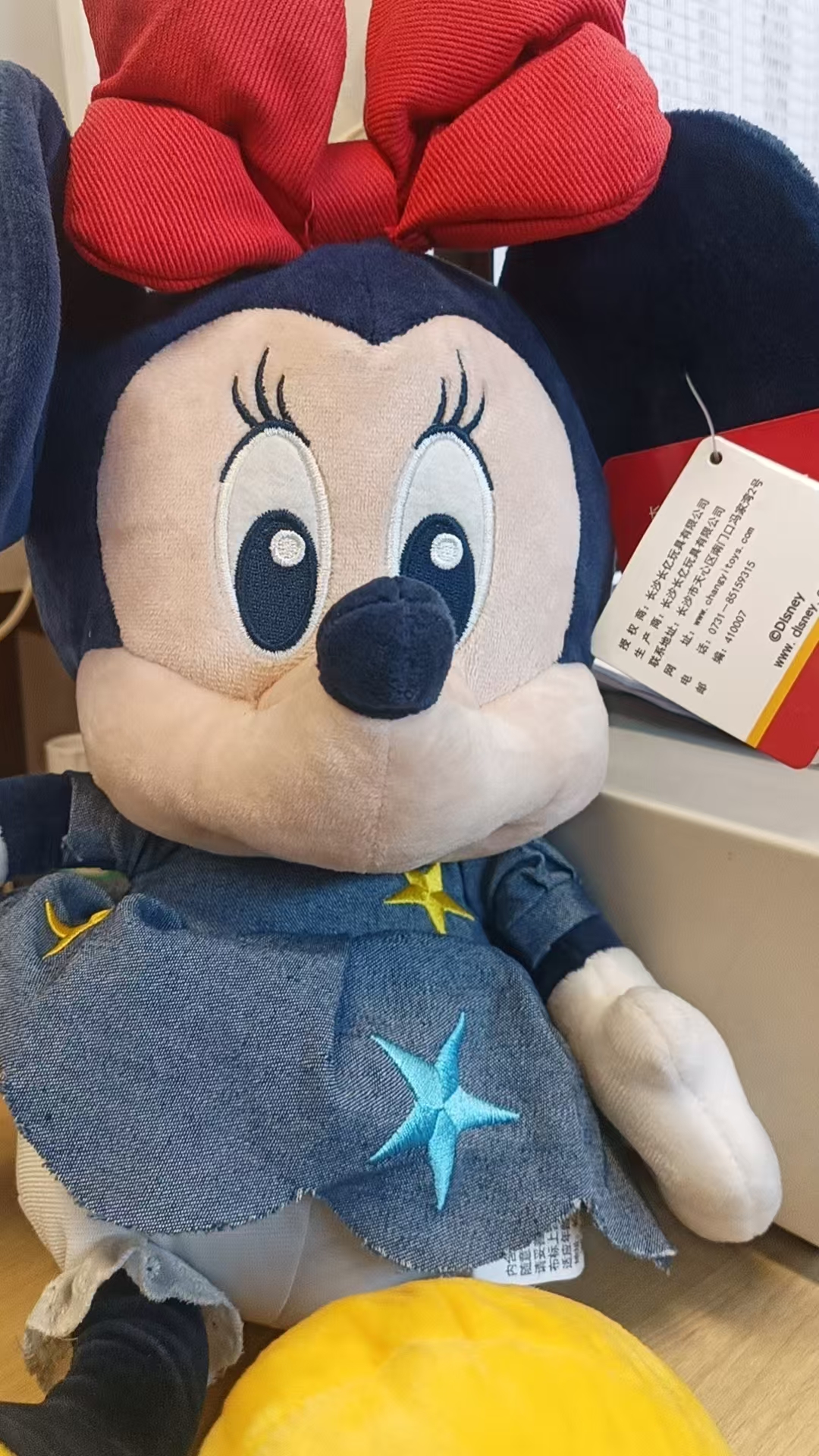这是迪士尼正版授权的米妮毛绒公仔,经典米妮形象,头戴标志性大红蝴蝶结,身着牛仔风衣裙,裙上有星星刺绣点缀 。