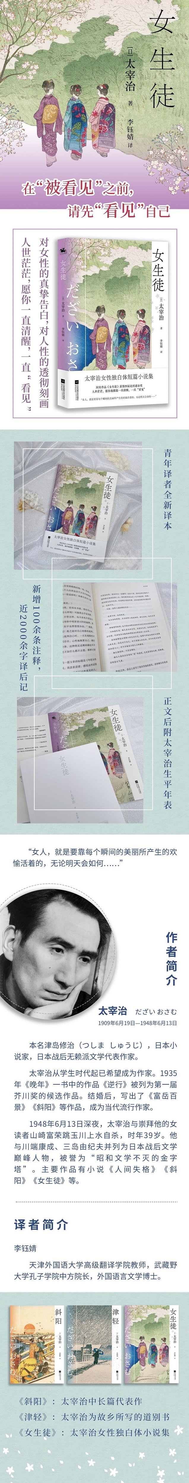 女生徒:日本无赖派文学代表太宰治女性独白体短篇小说集(同名作品《女生徒》获第四届北村透谷奖) 女性独白体短篇集,展现太宰治罕见的、温柔的一面。共收录十一篇短篇作品,以“少女—暮年”为时间轴呈现不同年龄、不同身份的女性所面临的生存困境,鼓励女性看见自己,追求爱与自由。