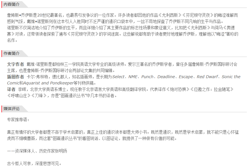 詹姆斯?乔伊斯是20世纪最著名,也最易引发争议的一位作家。许多读者都因他的作品《尤利西斯》《芬尼根守灵夜》的晦涩难解而感到气馁,戴维?诺里斯则在这本引人入胜同时不乏严谨的通识口袋本中,一丝不苟地探查了乔伊斯不同凡响的生平与作品。 诺里斯不仅简洁地介绍了乔伊斯的生平,而且详细介绍了其主要作品的标志性场景和象征意义,比如把《尤利西斯》与荷马《奥德赛》对读,还带领读者探索了遍布《芬尼根守灵夜》的字词迷