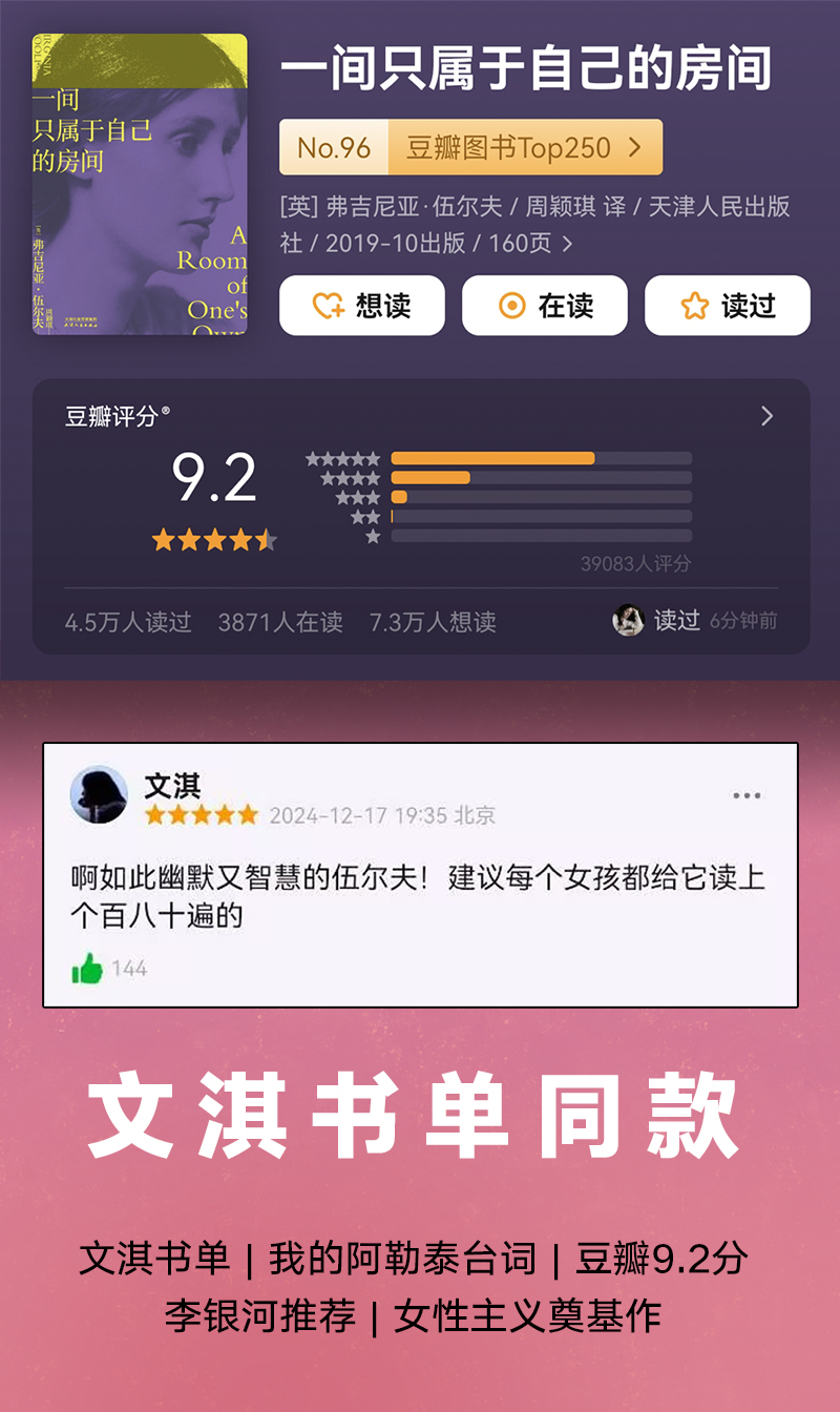 豆瓣9.2高分译本,万人好评。伍尔夫代表作,激励无数女性觉醒。女人要想写作,必须有钱,有一间只属于自己的房间。精装典藏版,雅致轻盈。果麦出品