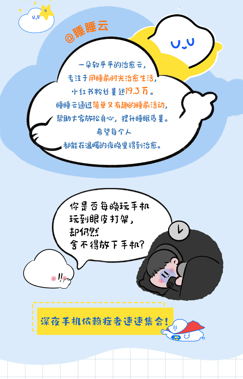 睡睡云 处女作,带你完成50个睡前治愈小活动,专治深夜手机依赖症,另有给现代人开具的睡前“情绪处方”:针对周日焦虑、深夜emo、睡前信息过载等现象,让你“放下手机,立地入睡”。