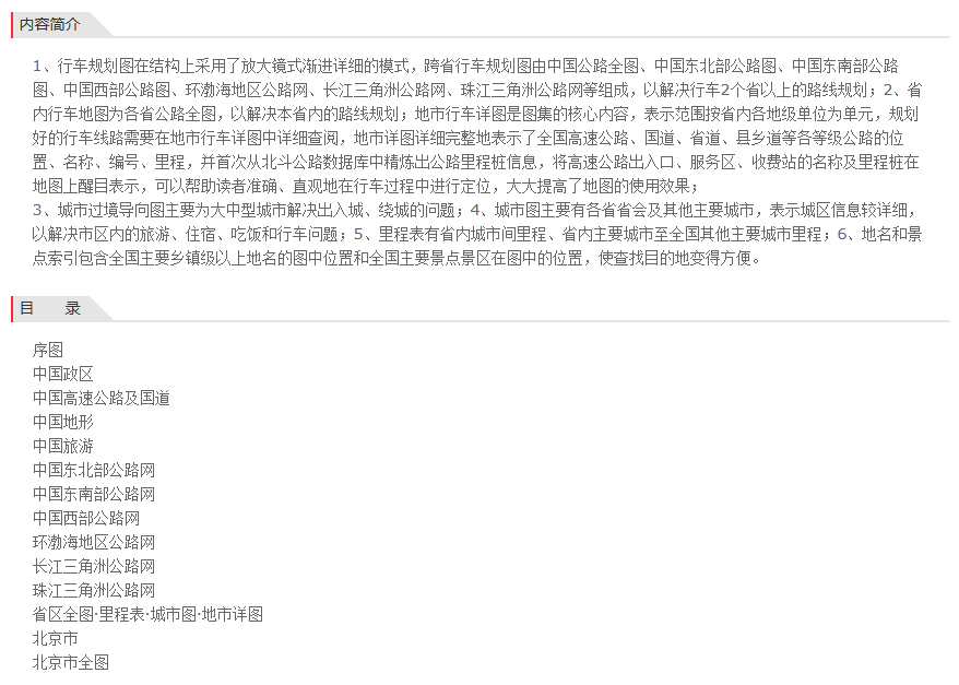 本图集由7幅跨省行车规划图、34幅省内行车地图、197幅地市行车详图、160幅城市过境导向图、176幅城市图、31幅公路里程表、49页地名和景点索引等七大版块构成。 1、行车规划图在结构上采用了放大镜式渐进详细的模式,跨省行车规划图由中国公路全图、中国东北部公路图、中国东南部公路图、中国西部公路图、环渤海地区公路网、长江三角洲公路网、珠江三角洲公路网等组成,以解决行车2个省以上的路线规划; 2、省
