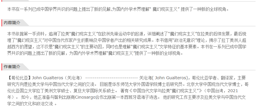 关沧海( John Gualteros),哥伦比亚学者、翻译家,主要研究方向是拉美文学与中国当代文学之间的交流。 目前是华东师范大学外国语学院博士后研究员。北京大学中国现当代文学博士,哥伦比亚国立大学拉丁美洲文学硕士、复旦大学国际关系硕士。
