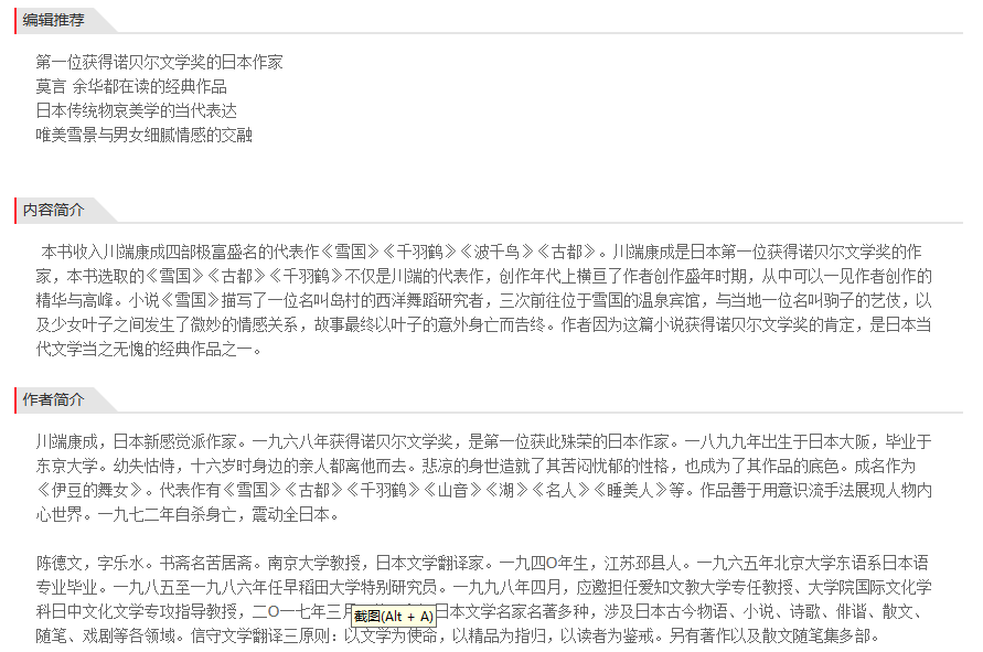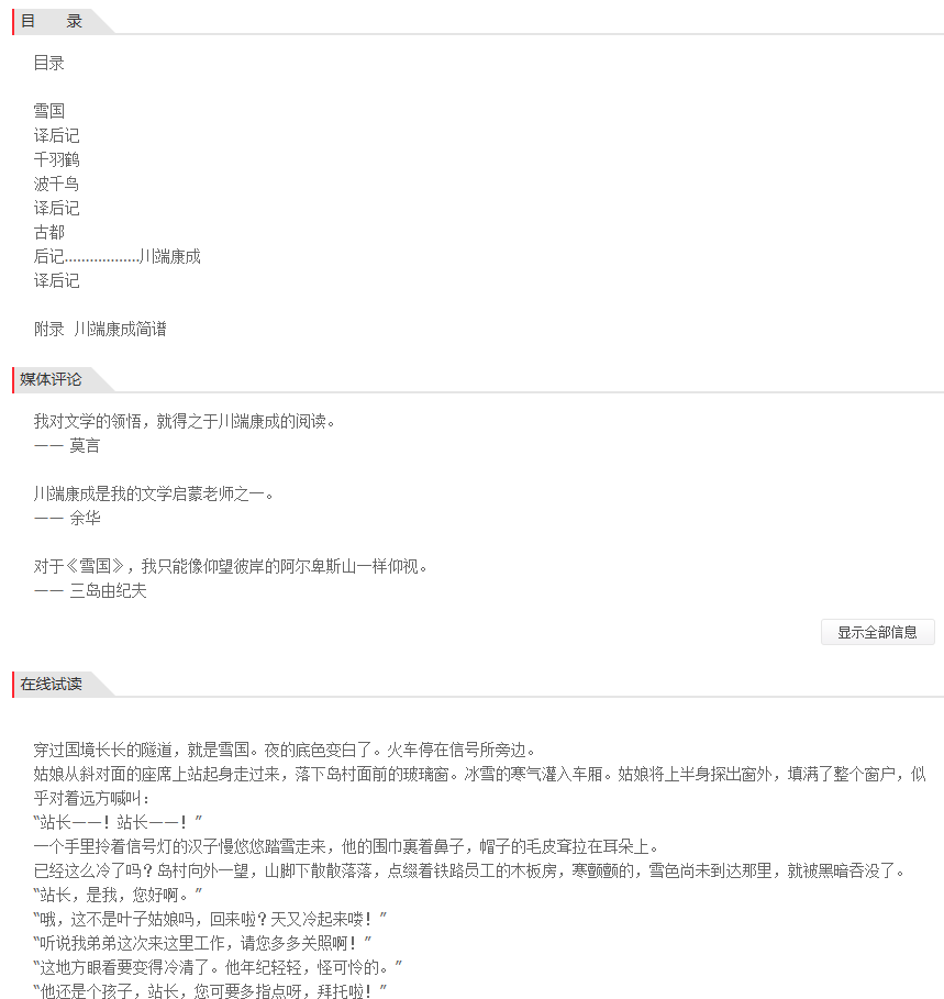 本书收入川端康成四部极富盛名的代表作《雪国》《千羽鹤》《波千鸟》《古都》。川端康成是日本第一位获得诺贝尔文学奖的作家,本书选取的《雪国》《古都》《千羽鹤》不仅是川端的代表作,创作年代上横亘了作者创作盛年时期,从中可以一见作者创作的精华与高峰。小说《雪国》描写了一位名叫岛村的西洋舞蹈研究者,三次前往位于雪国的温泉宾馆,与当地一位名叫驹子的艺伎,以及少女叶子之间发生了微妙的情感关系,故事最终以叶子的意