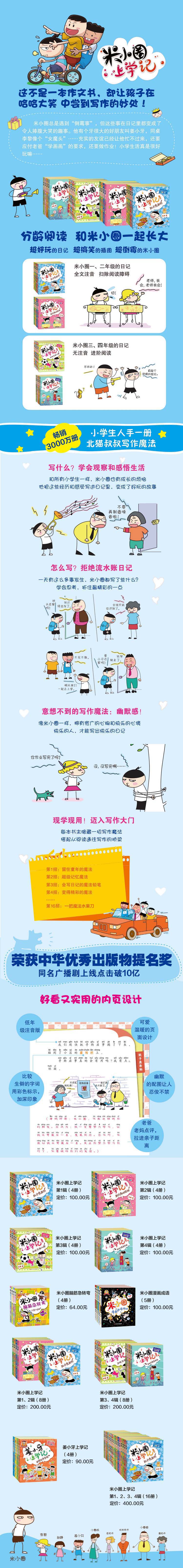 《米小圈上学记》丛书内容简介: 米小圈长大了,要去上小学了,他不会永远待在幼儿园,虽然这是他的梦想。小学和幼儿园大不一样,这里有整天与他作对的同桌,有必须完成的家庭作业。总之,这里有各种新奇好玩的事儿。上学的日子总是快乐又烦恼的。米小圈把这些通通写在了自己的日记里。翻开这本日记你会发现,米小圈是他,或许也是你。 米小圈的三年级 《我有一个跟屁虫》 米小圈有一个麻烦的表弟叫大牛。每当