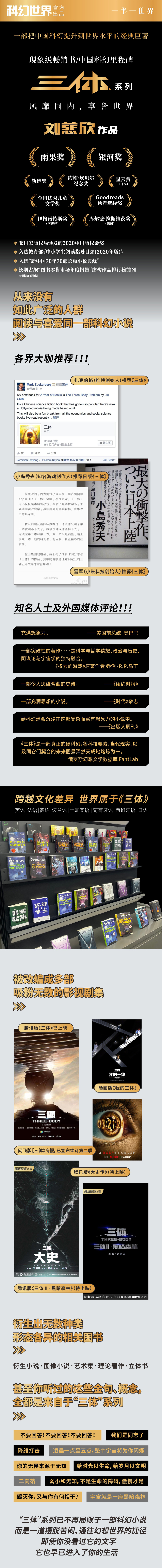 荣获世界科幻大奖 雨果奖 *长篇的亚洲科幻小说 三体作者刘慈欣 , 十届银河奖得主 单枪匹马将中国科幻提升到世界水平 科幻世界*官方权威典藏版本 用一套书读懂刘慈欣