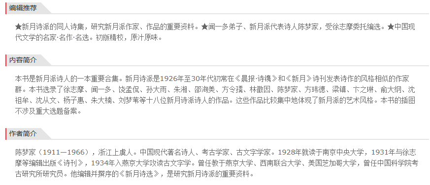 本书是新月派诗人的一本重要合集。新月诗派是1926年至30年代初常在《晨报·诗镌》和《新月》诗刊发表诗作的风格相似的作家群。本书选录了徐志摩、闻一多、饶孟侃、孙大雨、朱湘、邵洵美、方令孺、林徽因、陈梦家、方玮德、梁镇、卞之琳、俞大纲、沈祖牟、沈从文、杨子惠、朱大楠、刘梦苇等十八位新月诗派诗人的作品。这些作品比较集中地体现了新月派的艺术风格。本书的插图不涉及重大选题备案。