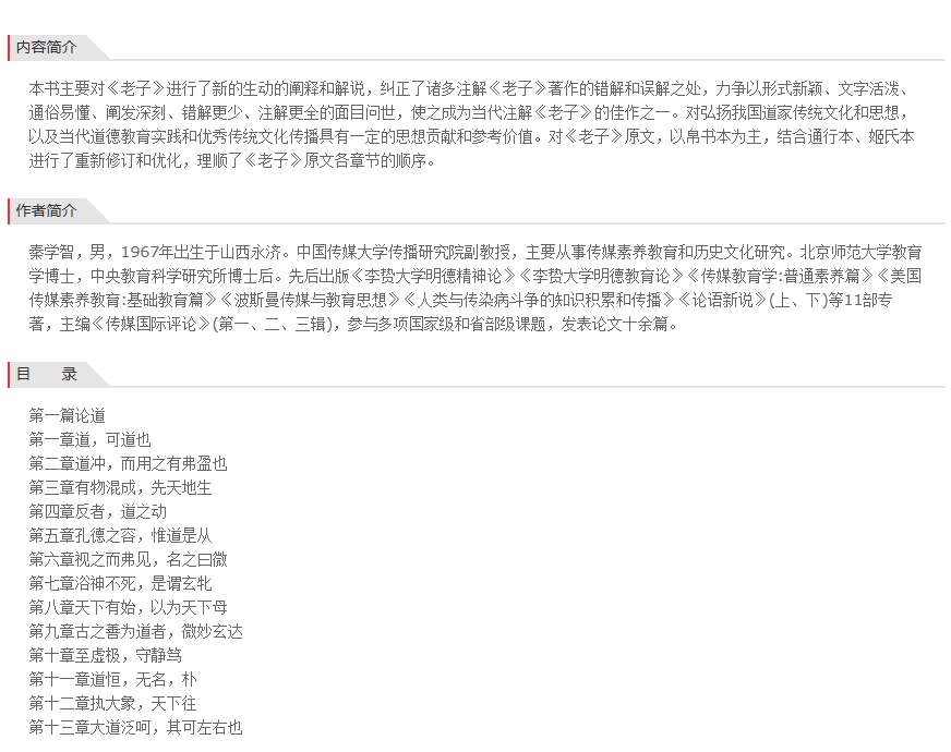 本书主要对《老子》进行了新的生动的阐释和解说,纠正了诸多注解《老子》著作的错解和误解之处,力争以形式新颖、文字活泼、通俗易懂、阐发深刻、错解更少、注解更全的面目问世,使之成为当代注解《老子》的佳作之一。对弘扬我国道家传统文化和思想,以及当代道德教育实践和优秀传统文化传播具有一定的思想贡献和参考价值。对《老子》原文,以帛书本为主,结合通行本、姬氏本进行了重新修订和优化,理顺了《老子》原文各章节的顺序