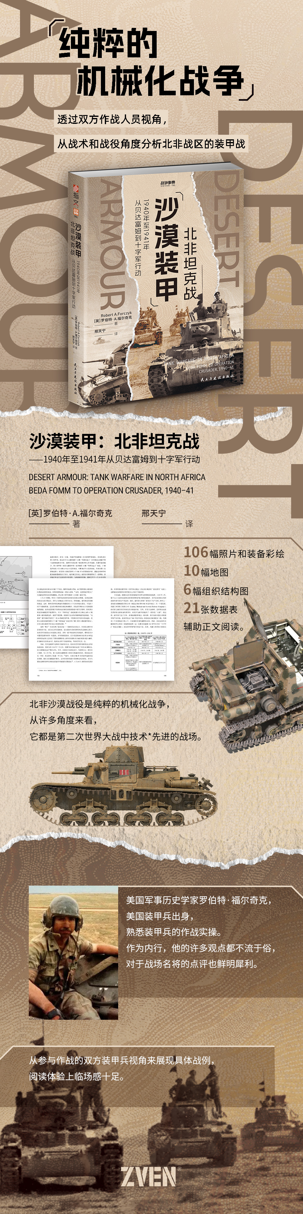 二战中,盟军和轴心国*队在北非沙漠展开的战争是纯粹的机械化战争,该战区先后运用了很多先进技术。这个战区也是英军、英联邦*队和后来的美军与轴心国*队在三年中一直保持接触的战区。 军事历史学家罗伯特·福尔奇克关于北非坦克战历史的书分为两卷,重*介绍了1940年—1941年在利比亚和埃及进行的装甲战,以及1942年—1943年的装甲战,包括突尼斯战役。《沙漠装甲:北非坦克战——1940年至1941年从贝