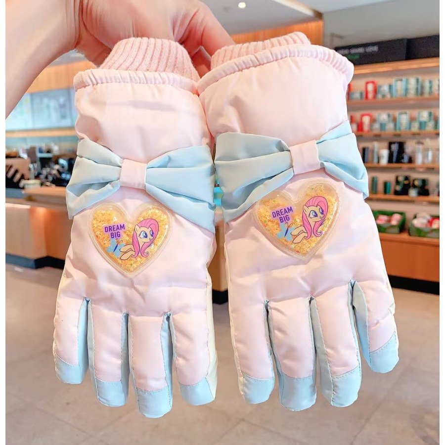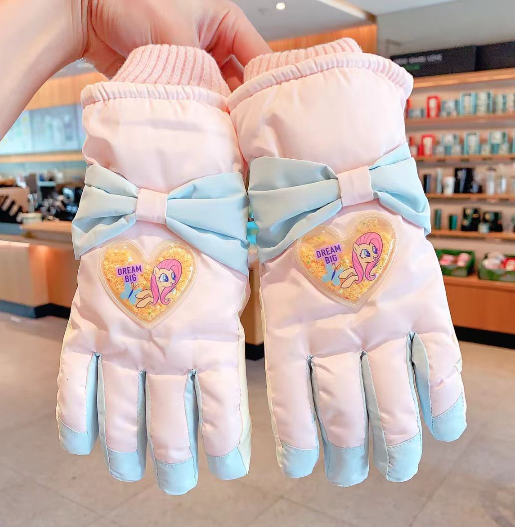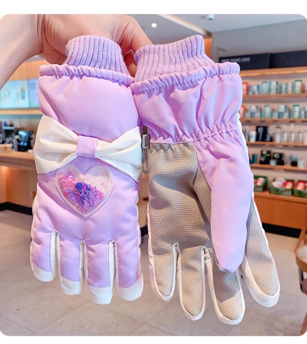 C5788中童小马爱心蝴蝶结滑雪五指IP手套(浅粉爱心流沙)