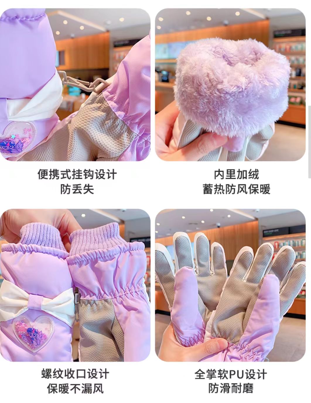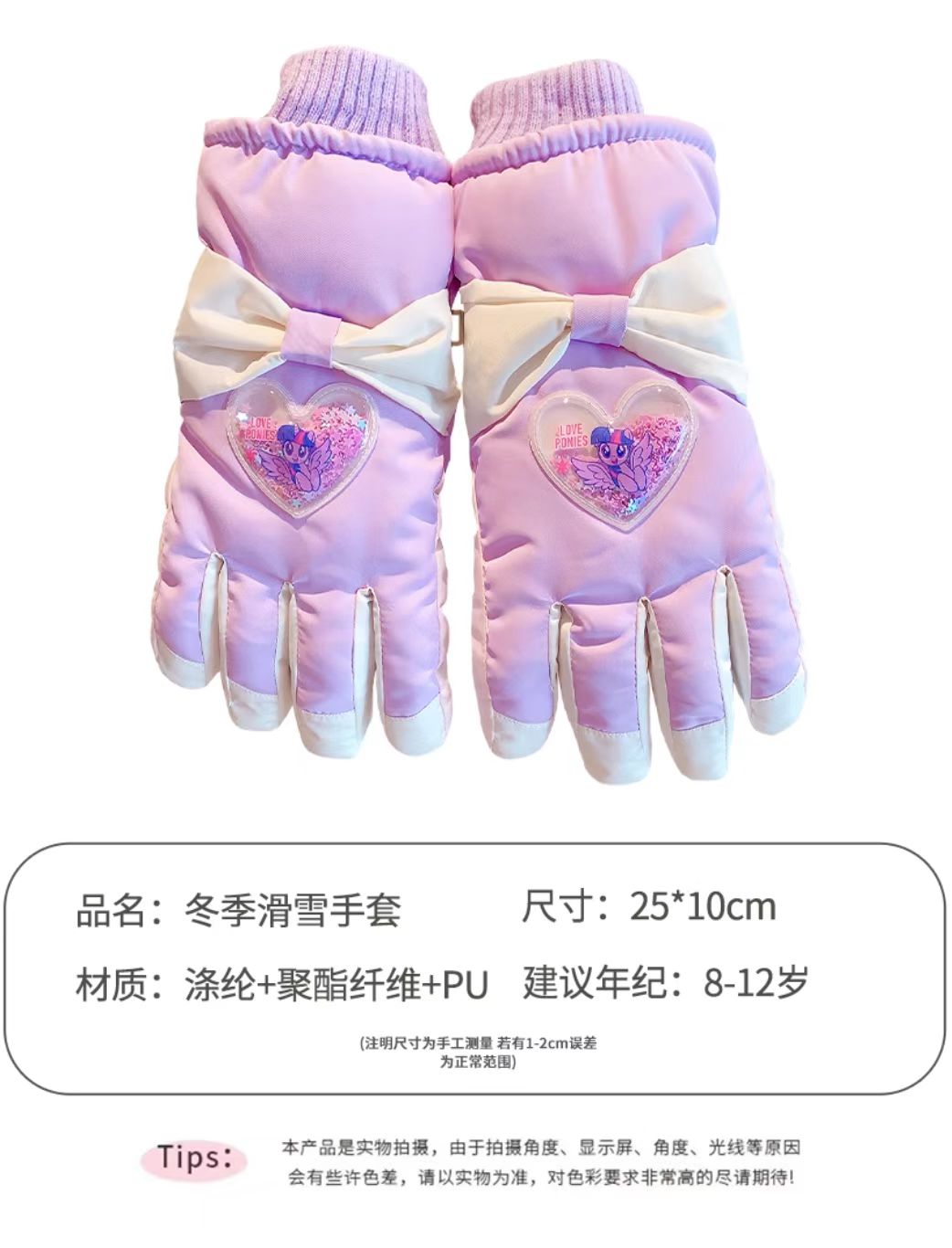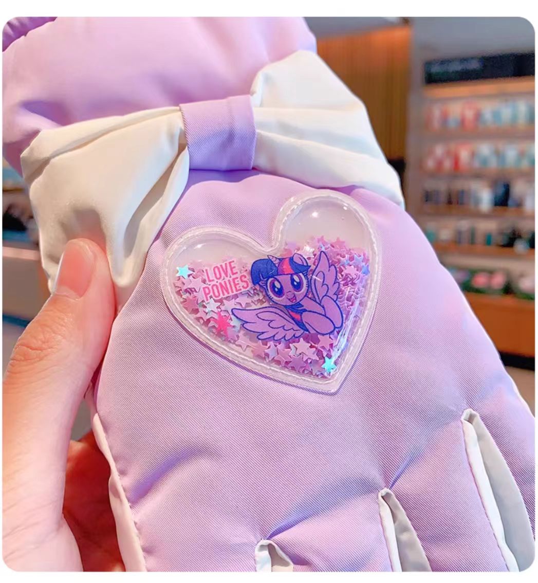 C5788中童小马爱心蝴蝶结滑雪五指IP手套(浅粉爱心流沙)