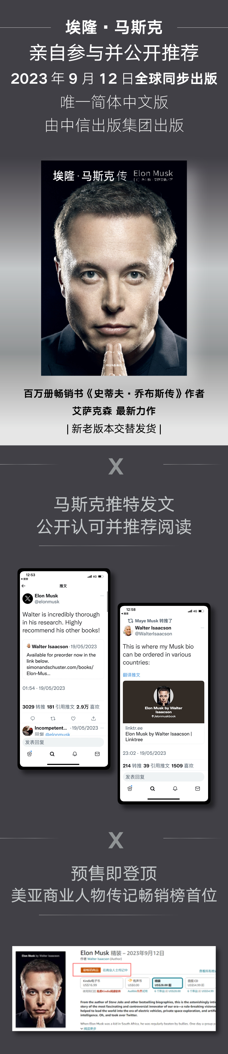 马斯克亲自参与并公开推荐,2023年9月12日全球同步出版,唯一简体中文版由中信出版集团出版。艾萨克森—百万册