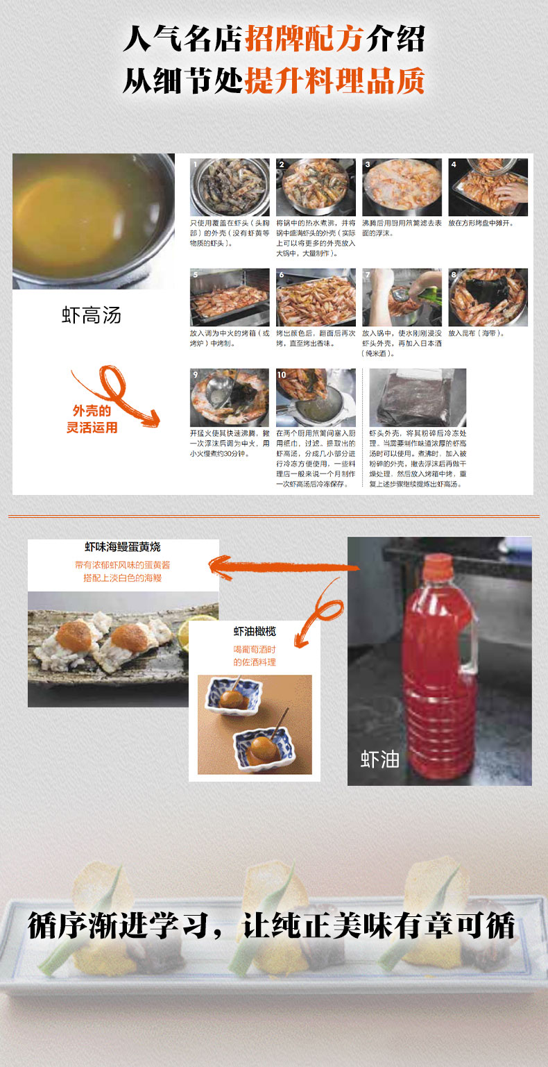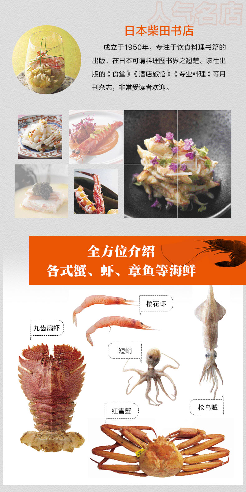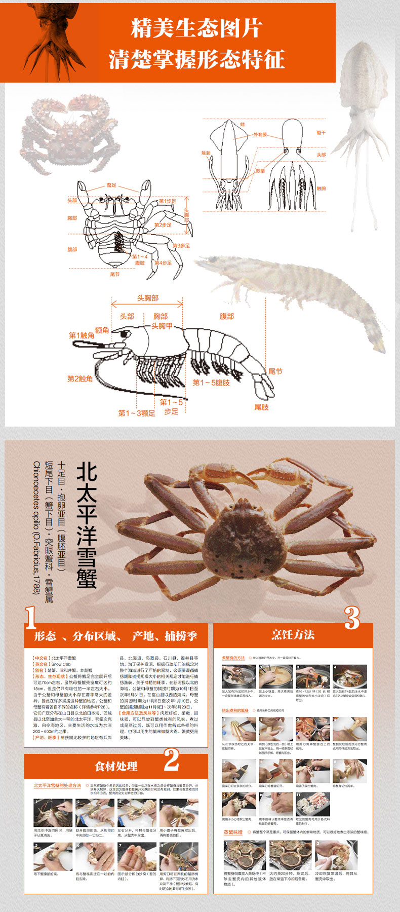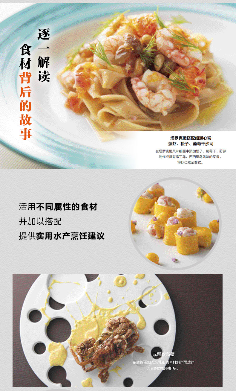 循序渐进学习,让纯正美味有章可循: 1、全方位介绍各式蟹、虾、章鱼等海鲜,逐一解读时令、分布、烹饪方法及食材背