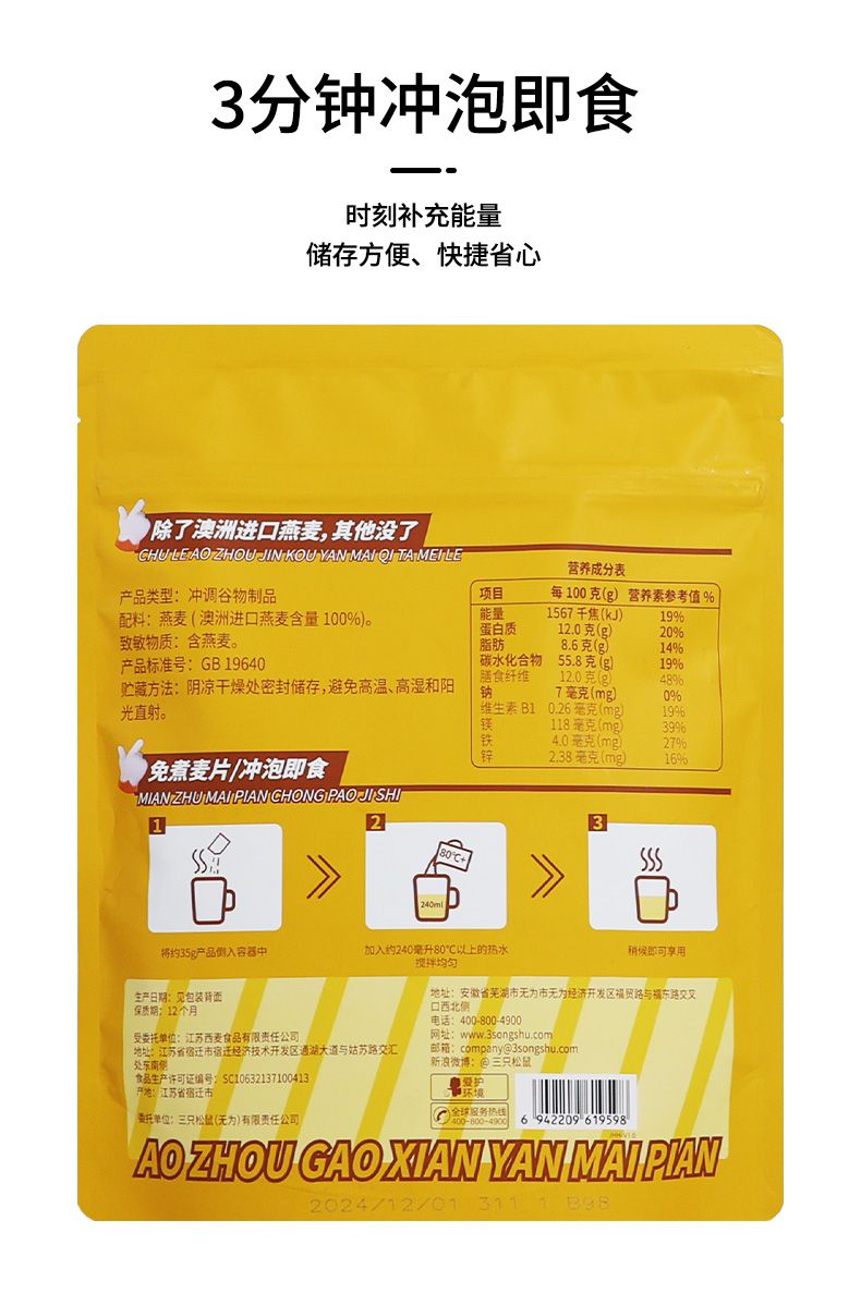 三只松鼠澳洲高纤燕麦片300gX3袋