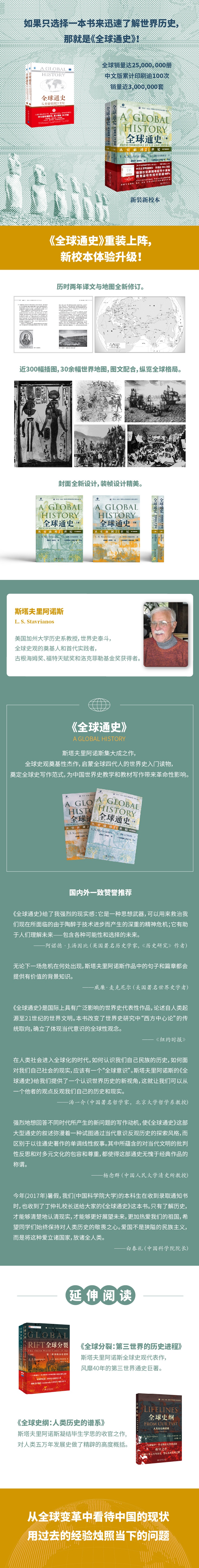 《全球通史》首开由历史学家运用全球观点囊括全球文明而编写的世界历史的先河。本书分八个部分,四十四个章节,主要讲述了世界历史的进化,世界文明的发展及其对现代社会的影响。作者着眼于全球,侧重于那些有影响的、促进历史发展的历史事件,其中包括原始社会、欧亚大陆的古代文明、欧亚大陆的原始文明、欧亚以外的世界、地区分割后的世界、西方世界的崛起、西方人统治的世界、西方的衰落与成功等八个主要的部分。重点突出,主题