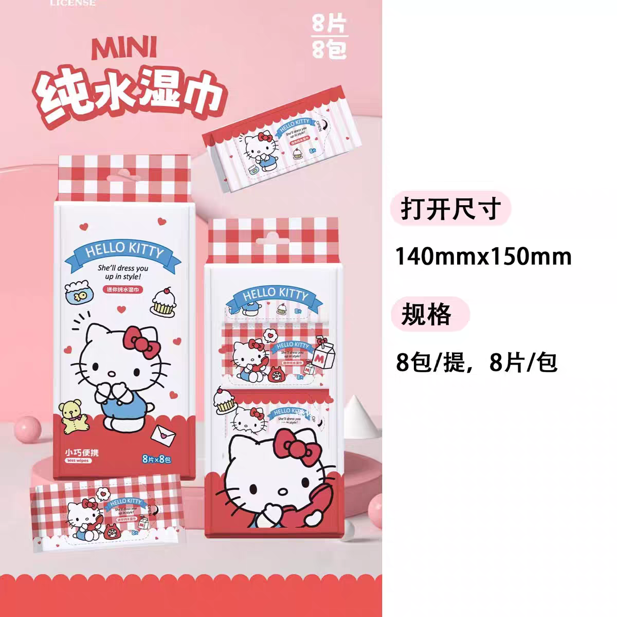 R-3161(8片*8包)三丽鸥迷你纯水湿巾组合装(5包-提)红色KT