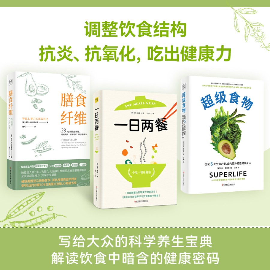 这套书包括《一日两餐》 《超级食物》 《膳食纤维》。《一日两餐》为读者提供了一种饮食新方式,颠覆我们习以为常的饮食习惯,结合全新的科学研究,告诉你人体的食欲和代谢到底如何运作,激素与禁食、减重之间的关系,让你可以终身保持健康的体重与身体状态。《超级食物》着眼于风靡全球的健康饮食新风尚——超级食物,本书为读者提供了一种详尽、全面、独特的健康方式,深入浅出地讲述了如何利用食物、水、氧气和pH平衡的超能力来修复失衡的身体,帮你开展可以持续一生的“超级生活”,把今天、明天乃至更遥远的未来过好。《膳食纤维》是美国知名胃肠病医生写给大众的肠道养护指南,百病从肠起,肥胖、糖尿病、阿尔茨海默症、心脏病、皮肤炎症等一系列大大小小的疾病与肠道有着鲜为人知的密切联系,膳食纤维就是让肠道恢复健康的不二法门。