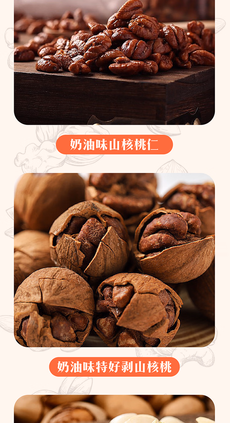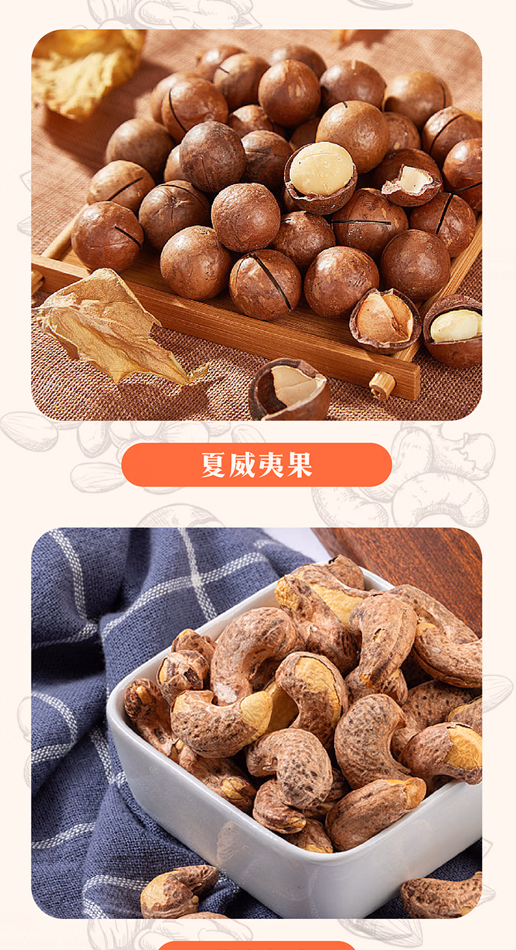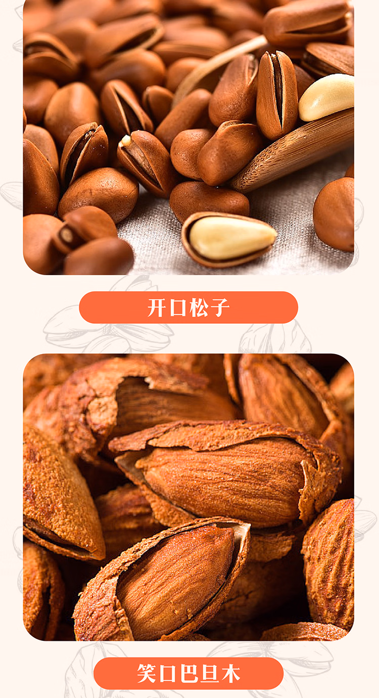 50克尊品奶油味山核桃仁 、50克尊品奶油味特好剥山核桃、 50克尊品开心果、 60克尊品千年香榧仁、 60克金钻开口松子/罐装 、230克壹品笑口巴旦木/方形罐、 268克夏威夷果/方形罐 、268克尚品紫衣腰果/方形罐、 258克精品原味榛子/方形罐