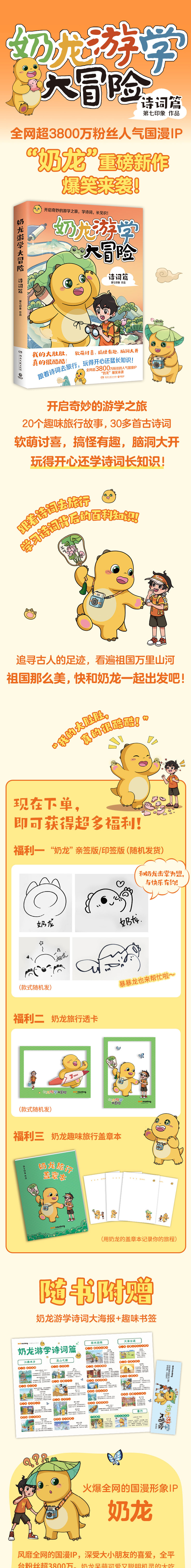 全网超3800万粉丝的国漫IP“奶龙”爆笑来袭,开启奇妙的游学之旅,跟着诗词去旅行,看遍祖国万里山河。软萌讨喜,搞怪有趣,玩得开心还猛学诗词长见识!随书赠书签和诗词旅行大海报