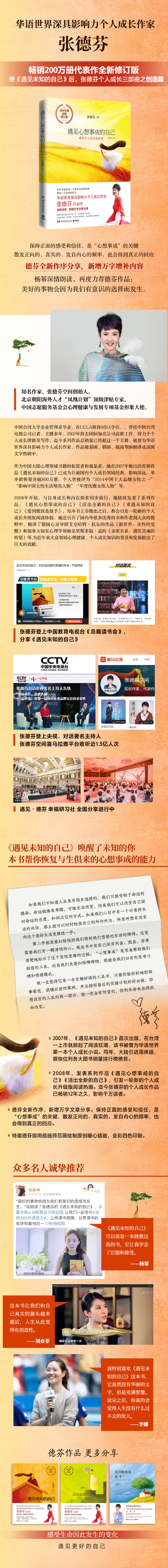《遇见心想事成的自己:200万册全新修订版》:继《遇见未知的自己》后,张德芬个人成长三部曲之创造篇,畅销200万册全新修订版。全新作序,新增万字文章分享:保持正面的感受和信任,是“心想事成”的关键。