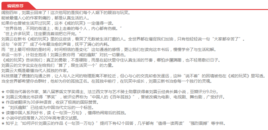 余华长篇小说。生猛又温柔,写尽少年成长中的彷徨苦涩与无所适从!李健、仁科挚爱,胡歌大张伟毛不易李雪琴推荐!“我不再装模作样地拥有很多朋友,而是回到了孤单之中,以真正的我开始了独自的生活。”