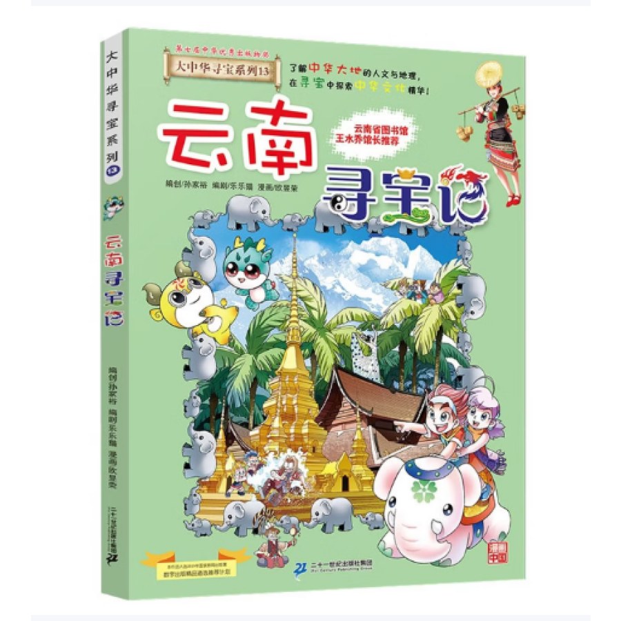“大中华寻宝系列”漫画版图书共34册,以23个省、5个自治区、4个直辖市、2个特别行政区为创作背景,讲述一群机敏睿智的少年,联合千年超能神兽,遍游祖国各地,展开奇妙玄幻的寻宝故事。丛书以独特的漫画元素和创新的故事语言,悬念叠出的情节和匠心独运的编创,将神州大地的地理风貌、历史遗迹、文化艺术、物产资源、民族风俗等内容巧妙融合,为读者开启一场场足尖上的中国之旅,是中华文化别开生面的呈现。