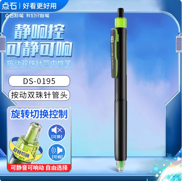 静音控,双珠针管笔头,可静可响双模式,内置防晃装置,Q弹软握胶。