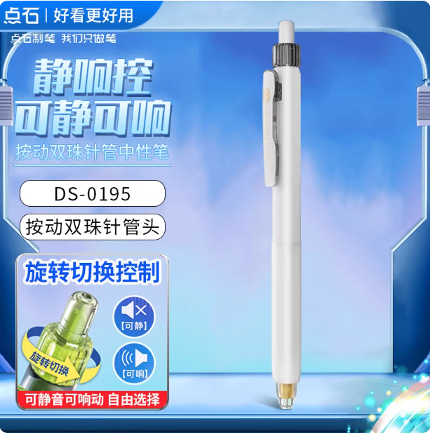 静音控,双珠针管笔头,可静可响双模式,内置防晃装置,Q弹软握胶。