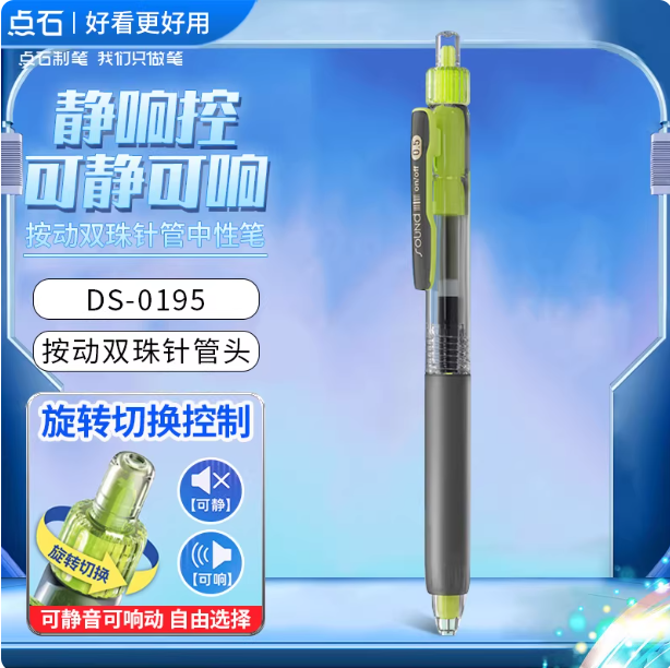静音控,双珠针管笔头,可静可响双模式,内置防晃装置,Q弹软握胶。