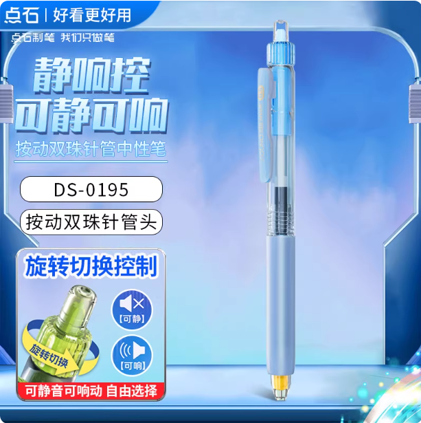 静音控,双珠针管笔头,可静可响双模式,内置防晃装置,Q弹软握胶。