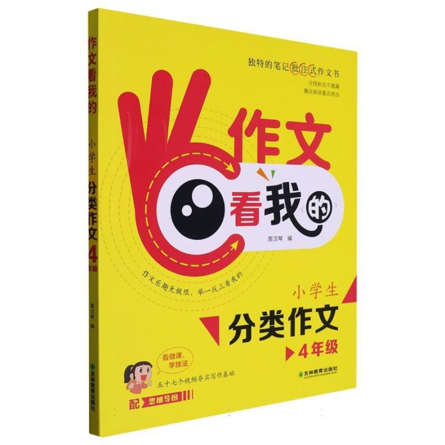 本书依据四年级的教学特点,精心挑选和设置 了六大作文辑别,涵盖了语文四年级课本共16个单 元的习作主题,体现了分类QM的特点。《作文看 我的》四年级分类作文按照先输入、后输出的训练 理念,设置了本书的各大板块,脉络清晰,难易有 度。书中除“开心指导站”,其余板块皆增设了笔 记批注,便于学生理解和吸收本书精华,提高知识 输入的效率。书中每个主题 的“同步链接”关 联了四年级上下册的习作真题,展示学生思路和习 作范文,以输出为目的,训练孩子的写作能力。